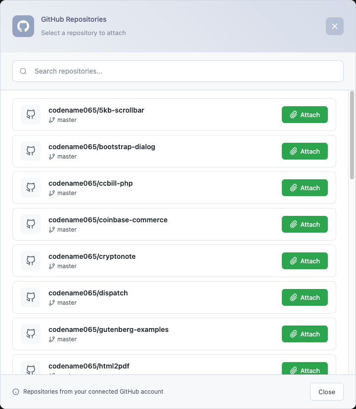 Browse your repositories in a sleek, modern interface. Search, filter, and attach repos in seconds – not minutes.